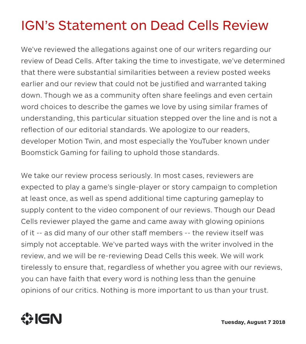 IGN caught plagiarizing in their official review of Dead Cells:
